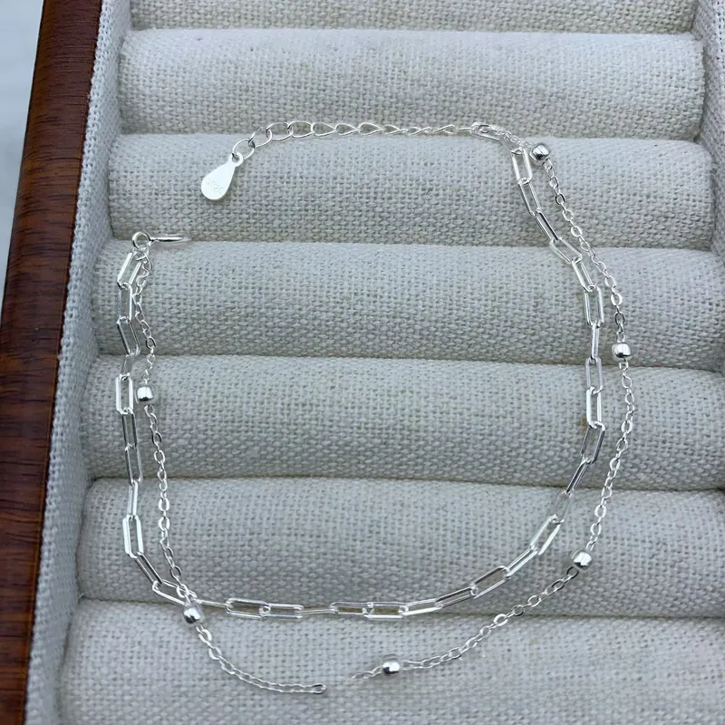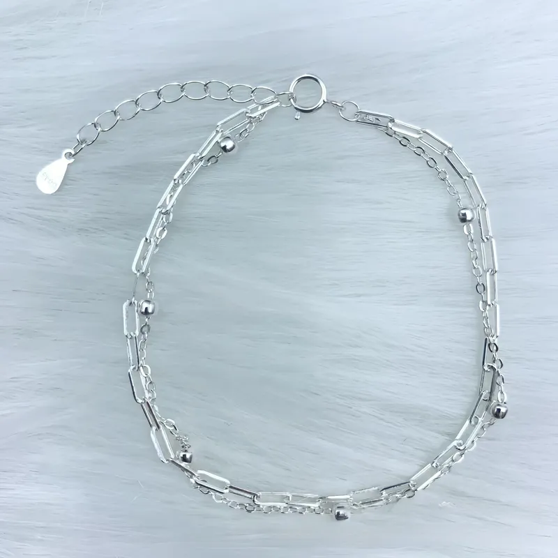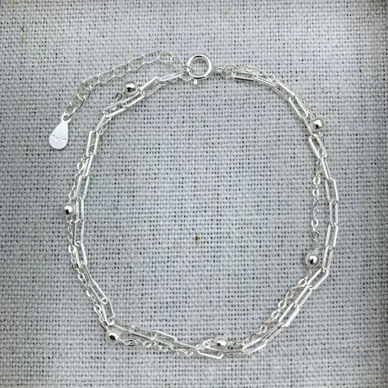 The first layer is a bold paperclip chain — rectangular hollow links in a geometric, architectural pattern that catches light from every angle. The second is a finer cable chain with polished silver beads spaced along its length, adding movement and contrast. Together, they create a textural interplay that looks intentional, curated, and effortlessly cool.