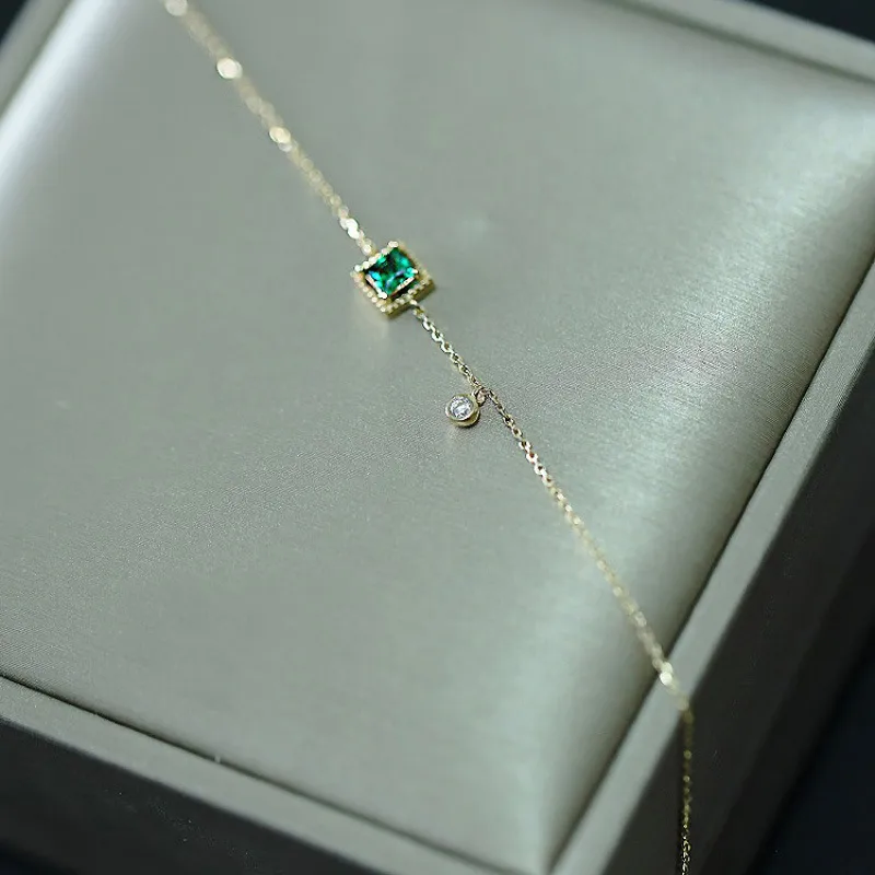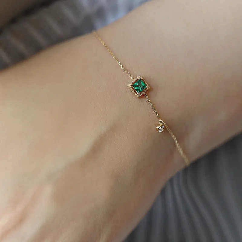 Refined, modern, and effortlessly luxurious — this geometric bracelet is a masterclass in understated elegance. A bold princess-cut emerald zirconia, encased in a delicate gold milgrain halo setting, takes centre stage on a whisper-thin cable chain. Offset along the chain, a single bezel-set white zirconia charm adds an unexpected asymmetric touch — subtle, sophisticated, and utterly captivating on the wrist.