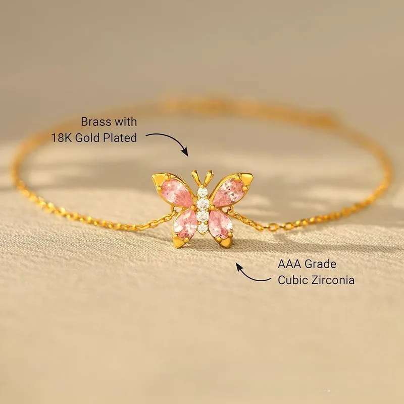 The butterfly has meant transformation, freedom, and beauty across cultures for centuries. Our Papillon Bracelet distils all of that into a single breathtaking centrepiece — a meticulously detailed butterfly pendant set entirely by hand with blush-pink and clear AAA-grade cubic zirconia stones.