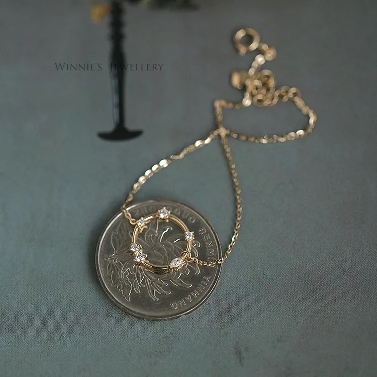 The open circle pendant sits centred on the wrist, framed by four cubic zirconia crystals — two round-cut and one marquise — arranged to feel intentional rather than overdone. The fine cable chain that carries it is just 1.2mm wide: present, but barely there. Gold light that wraps the wrist without weight.