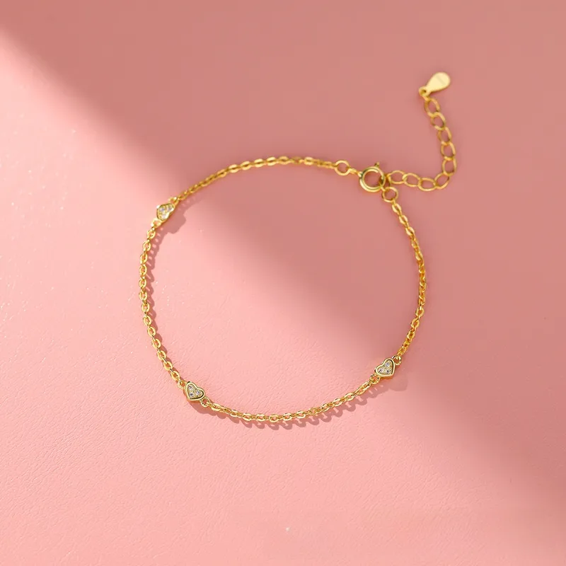Three perfectly crafted heart charms, each filled with brilliant cubic zirconia stones, are evenly spaced along a fine gold-plated 925 sterling silver chain. The warm gold tone adds a luxurious glow to any wrist, while the petite heart motif keeps it effortlessly feminine and timeless.